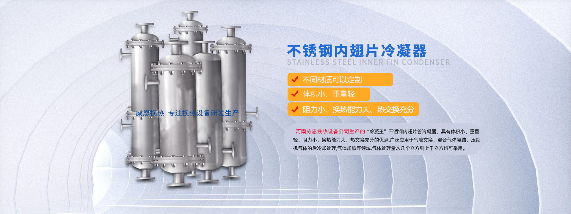 河南威恩換熱設(shè)備有限公司是一家專業(yè)生產(chǎn)制造螺旋板式換熱器、列管式換熱器、節(jié)能換熱設(shè)備的廠家,集科研、設(shè)計(jì)、生產(chǎn)、銷售、工程安裝、調(diào)試為一體的技術(shù)型企業(yè)。公司成立以來(lái)一直致力于節(jié)能環(huán)保換熱設(shè)備的研發(fā)生產(chǎn),主要產(chǎn)品包括螺旋板換熱器、列管式換熱器、內(nèi)翅片冷凝器以及鋼制儲(chǔ)罐、反應(yīng)釜等的研發(fā)設(shè)計(jì)與銷售。公司研發(fā)生產(chǎn)的螺旋板式換熱器,傳熱效率高、可靠性高、阻力小、不易堵塞、可有效回收低品位熱能,已經(jīng)廣泛應(yīng)用到化學(xué)、石油、溶劑、醫(yī)藥、食品、輕工、紡織、冶金、軋鋼、焦化等行業(yè),取得了良好的效果,得到顧客的廣泛認(rèn)可和一致好評(píng)。針對(duì)制藥行業(yè),本公司生產(chǎn)的新型不銹鋼內(nèi)翅片換熱... 【了解更多】